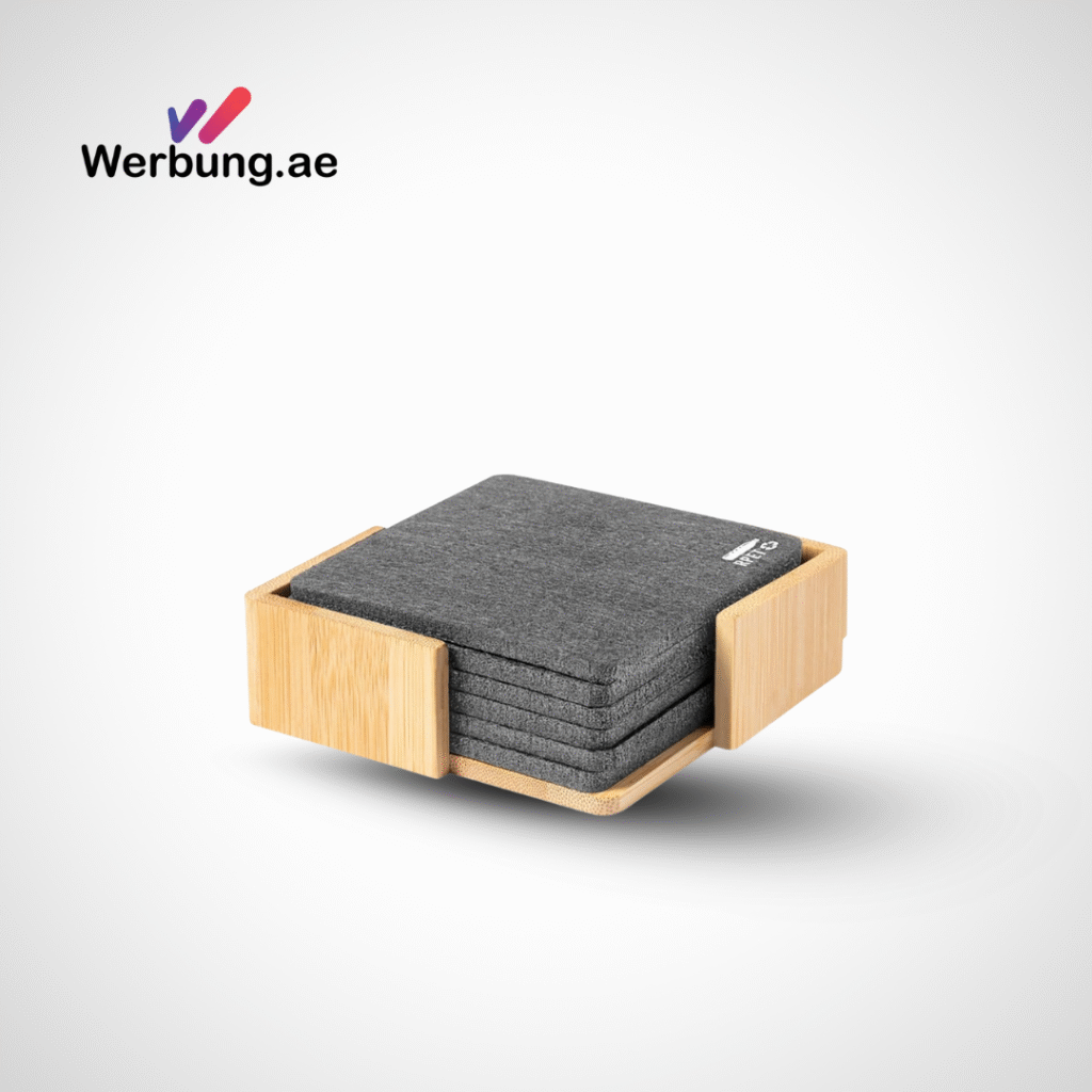 Add eco-style to your space with this set of 6 recycled RPET felt coasters by Werbung.ae, neatly arranged in a sleek bamboo