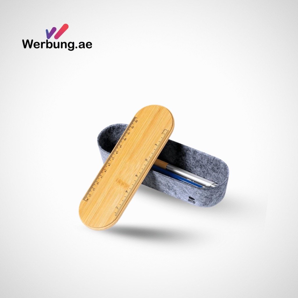 Stay organized with this multi-functional stationery case by Werbung.ae, made from a bamboo lid and recycled RPET felt. The lid doubles as a ruler (cm/inch) and phone stand when inverted. Secured with an elastic fastener and packed in an ecofriendly kraft box—smart, sustainable, and stylish.