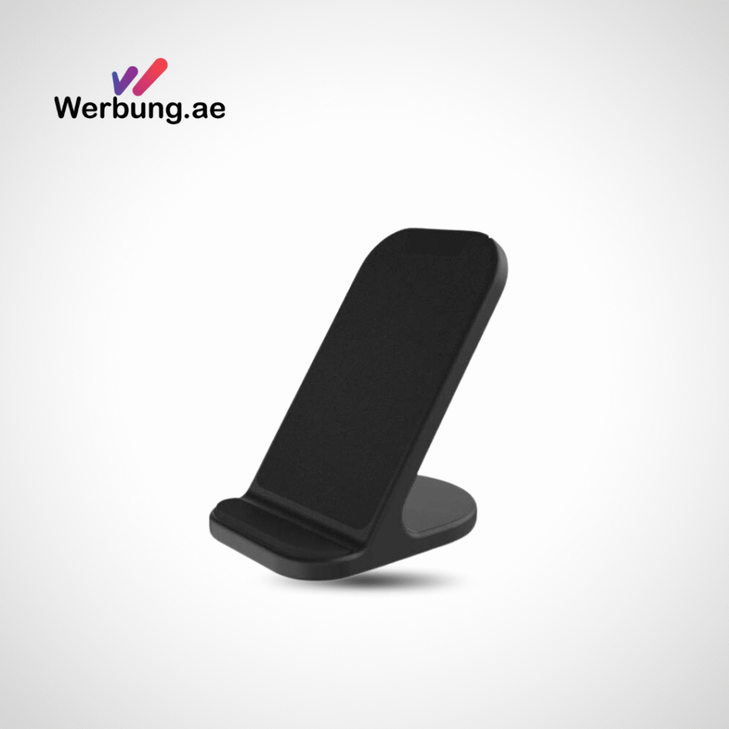 Werbung.ae 10W Dual Coil Wireless Charger & Phone Stand – Made from 69% recycled ABS and recycled PU leather, this eco friendly charger offers dual-coil technology for better compatibility. Supports vertical and horizontal charging. Includes recycled TPE cable and comes in a recycled kraft gift box