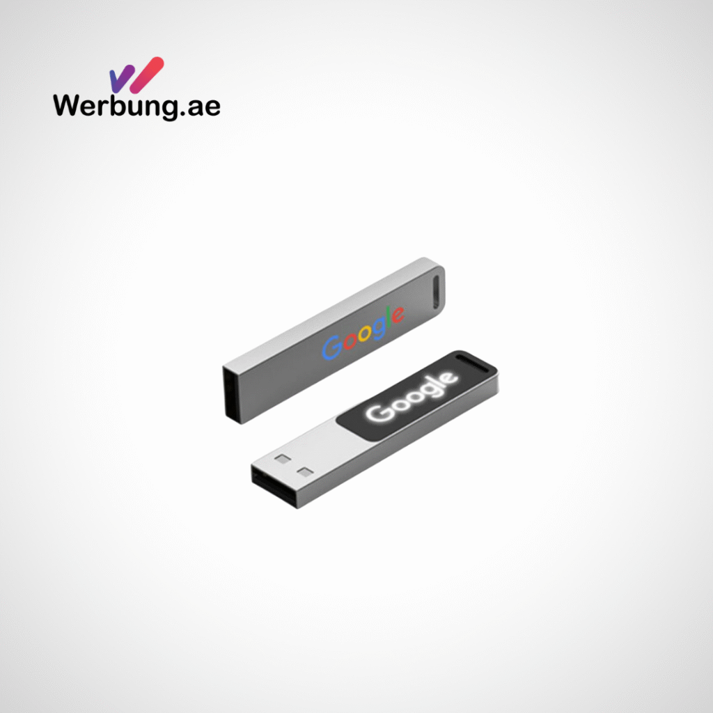 Werbung.ae Metal Silver USB Flash Drive with light-up logo engraving makes your brand shine. Featuring a sleek design (5x1.3x0.5cm) and durable metal build, it combines style with functionality. Available in 8GB, 16GB, and 32GB capacities,
